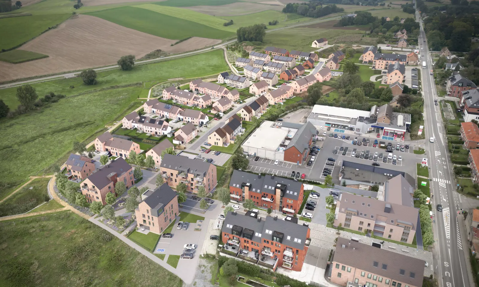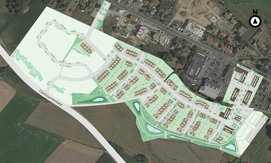 Belle Vallée se niche dans les hauteurs de Jodoigne, une ville à taille humaine résolument champêtre et agricole qui jouxte les provinces du Brabant flamand, de Namur et de Liège. C'est dans cet environnement vert que se développe ce quartier familial.