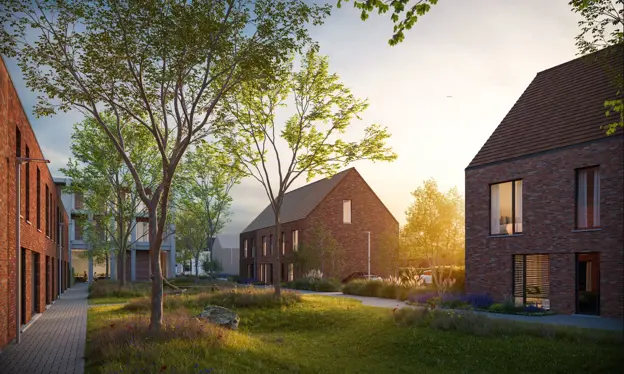 Aan de Wandelweg in Deerlijk werken we aan zo’n buurtontwikkeling: De Weverie. De 60 are grote site van de voormalige weverij was volledig bebouwd en wordt met het inbreidingsproject onthard om ruimte te geven aan de natuur en energie-efficiënte woningen voor gezinnen. Er komen 18 duurzame woningen – 16 huizen en 2 appartementen – rond een nieuw buurtpark van zo’n 20 are. Bijkomend wordt bijna 1 are van de Wandelweg ook onthard en heraangelegd met groen.