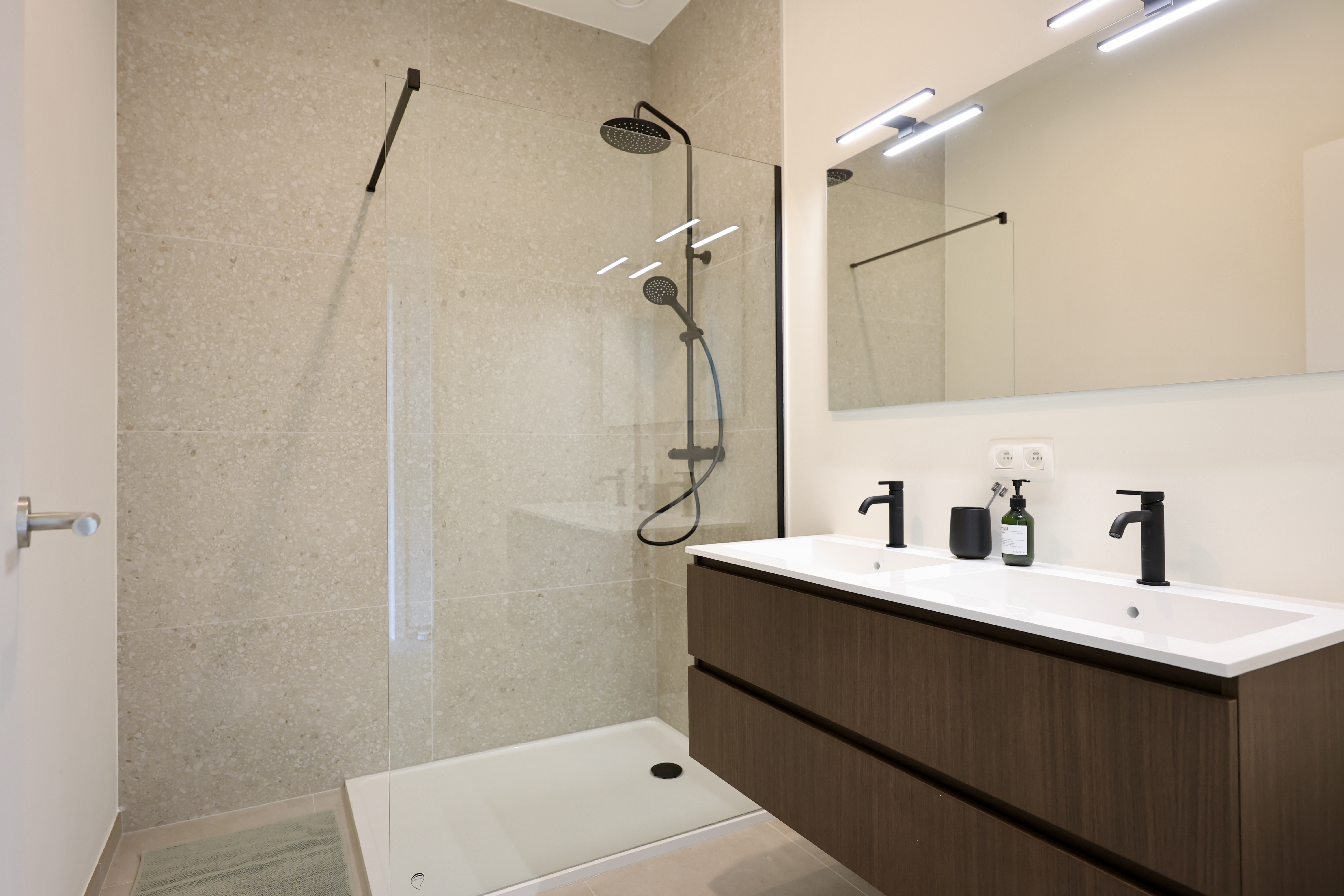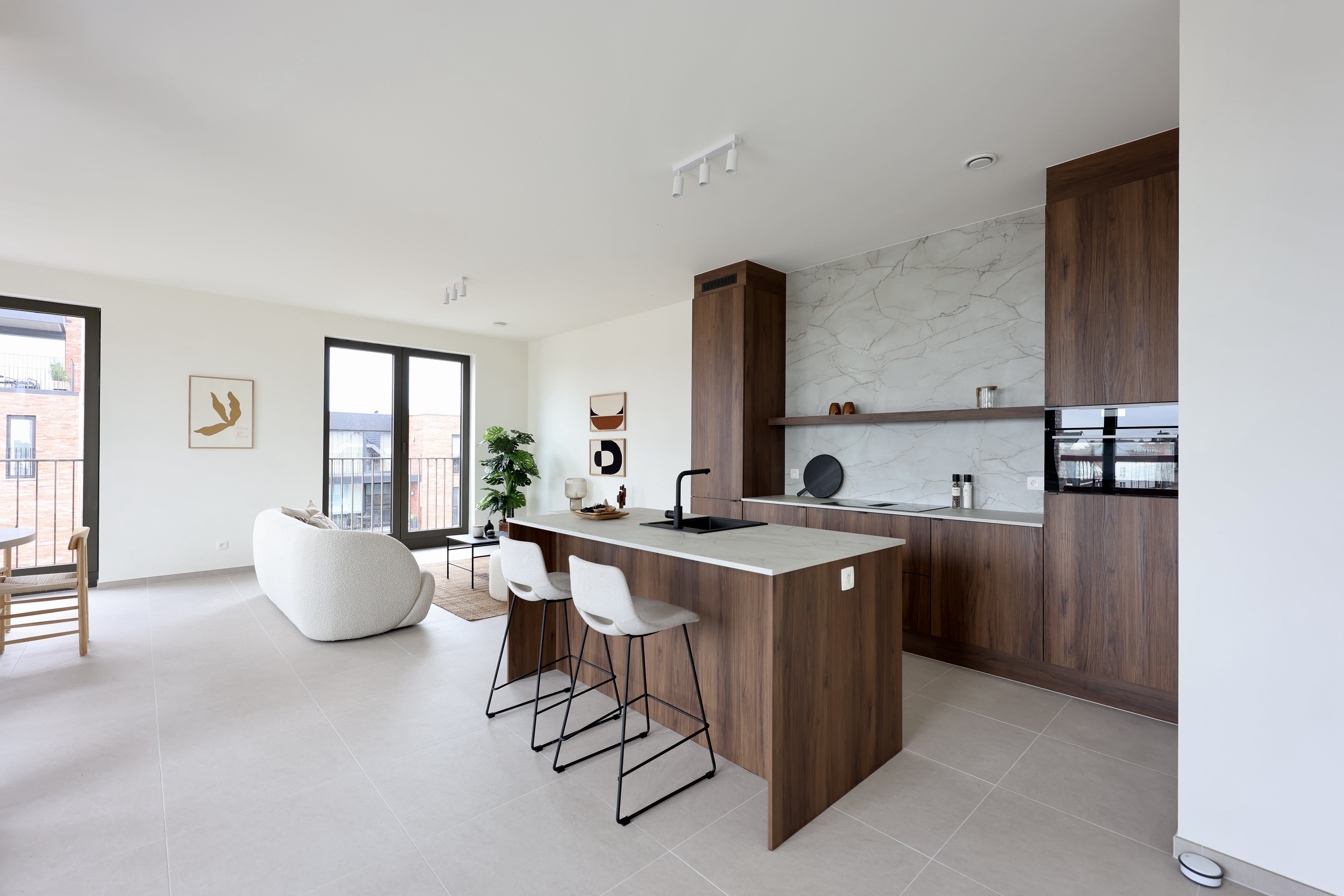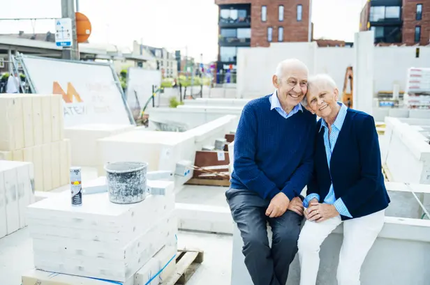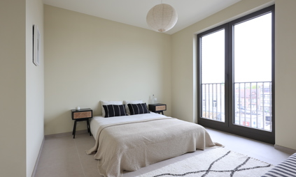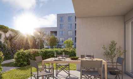 Ook de buitenruimte speelt een belangrijke rol. Bewoners genieten van een groene binnentuin en een collectieve daktuin van 300 m² — bijna zo groot als een tennisbaan — die rust en ontmoeting brengt.
