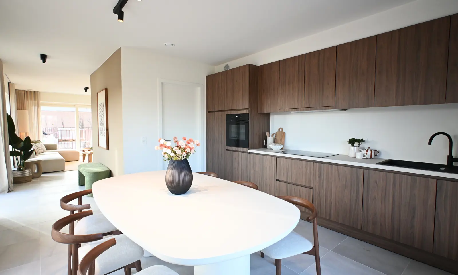 De kijkwoning beschikt over een lichtrijke leefruimte met open keuken. De afwerking op maat is van onberispelijke kwaliteit.