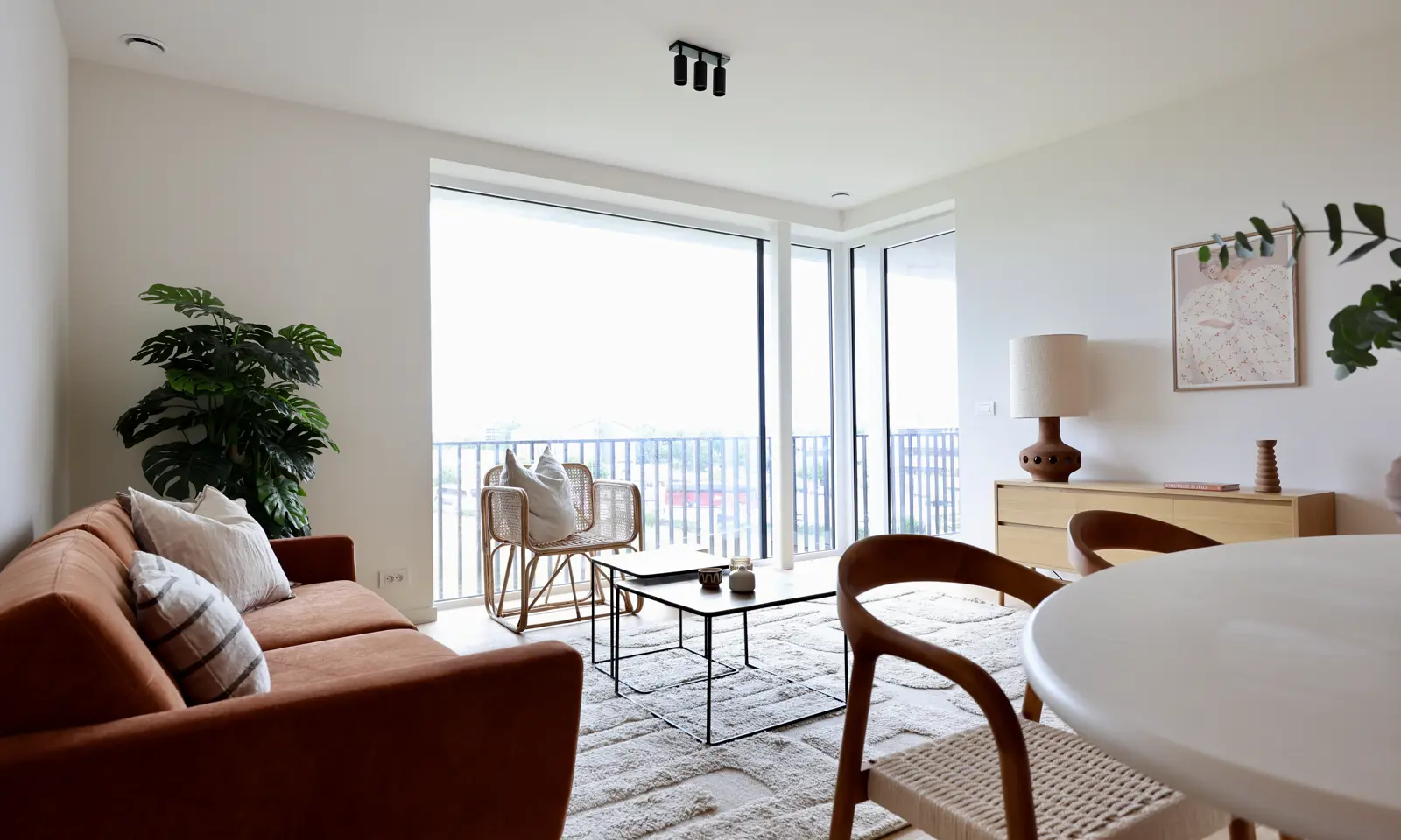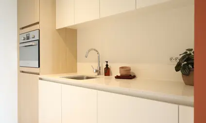 Het kijkappartement beschikt over een lichtrijke leefruimte met open keuken. De afwerking op maat is van onberispelijke kwaliteit.